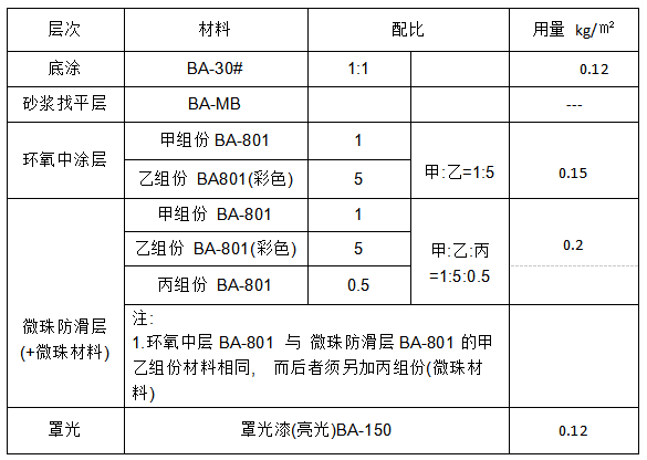 施工流程:材料说明:施工步骤说明:1.涂环氧底油:涂BA-30#。2.砂浆找平层: BA-MB将基底进行找平。(视现场地坪实际情况而定)。3.环氧中涂层:先用带颜色的BA-801(甲乙组份)刮涂一遍,薄刮,满刮均匀,不漏底即可,待干。(注:中间这一层不需要加 微珠材料。)4.微珠防滑层:再用带颜色的 BA-801(甲乙组份)+ 丙组份(微珠),搅匀,薄刮一遍,一边刮涂,一边用羊毛滚筒收涂至均一的微珠效果为止。5.罩光层:在微珠防滑面上施...