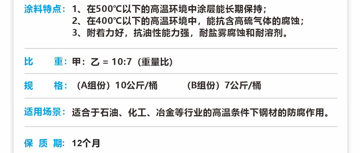 BA-5291是一种双组份可耐高温的水性无机硅酸酯涂料,具有以下特性: 1、在500℃以下的高温环境中涂层能长期保持; 2、在400℃以下的高温环境中,能抗含高硫气体的腐蚀; 3、附着力好,抗油性能力强,耐盐雾腐蚀和耐溶剂。