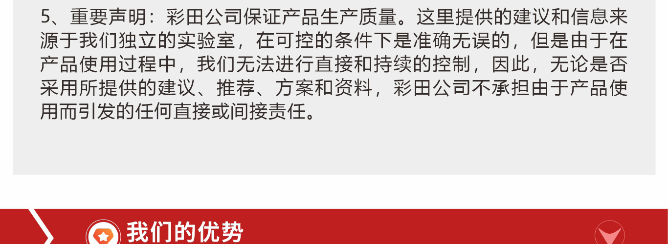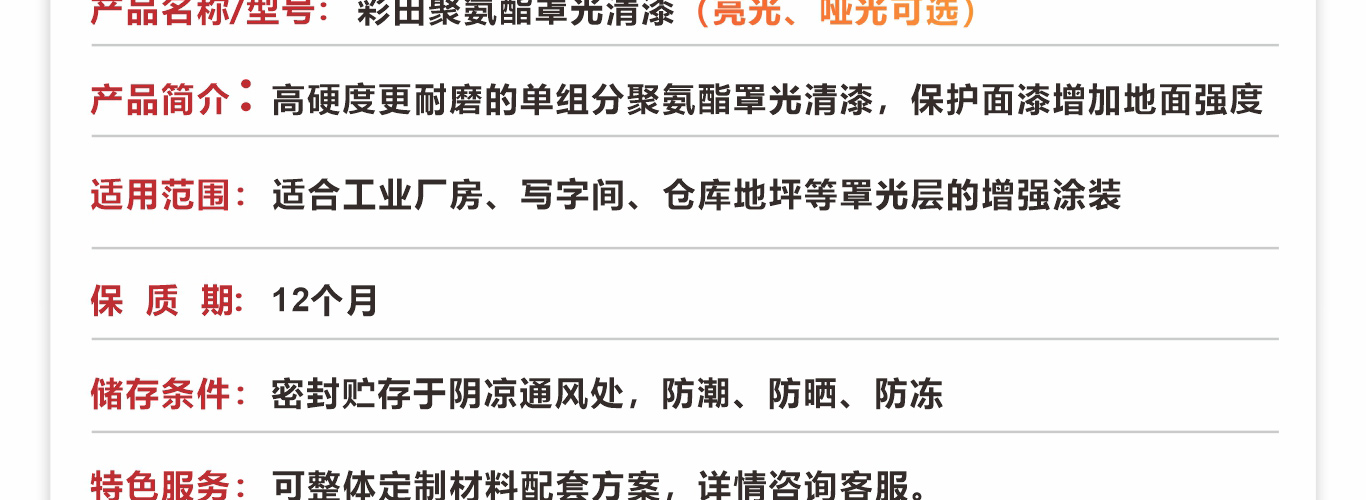 彩田聚氨酯罩面清漆具有很高的硬度和耐磨性能;可以在较低温度和高湿度的环境中施工使用;具有很好的耐划伤性能。